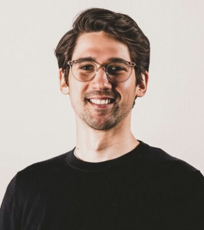 A person is typing on a silver laptop with a screen displaying text about designing digital solutions for big customers. Nearby, there is a black smartphone and white earphones placed on the desk. The person's sleeves are light blue, suggesting a casual attire.